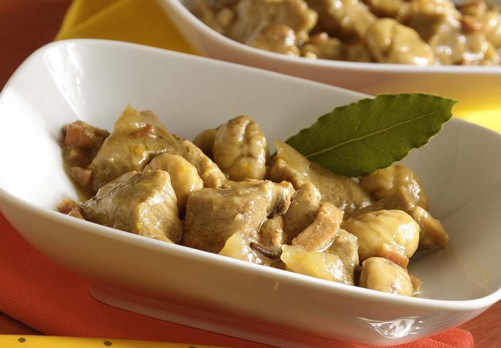 Estofado de carne de cordero con menestra de verduras y puré de patatas
